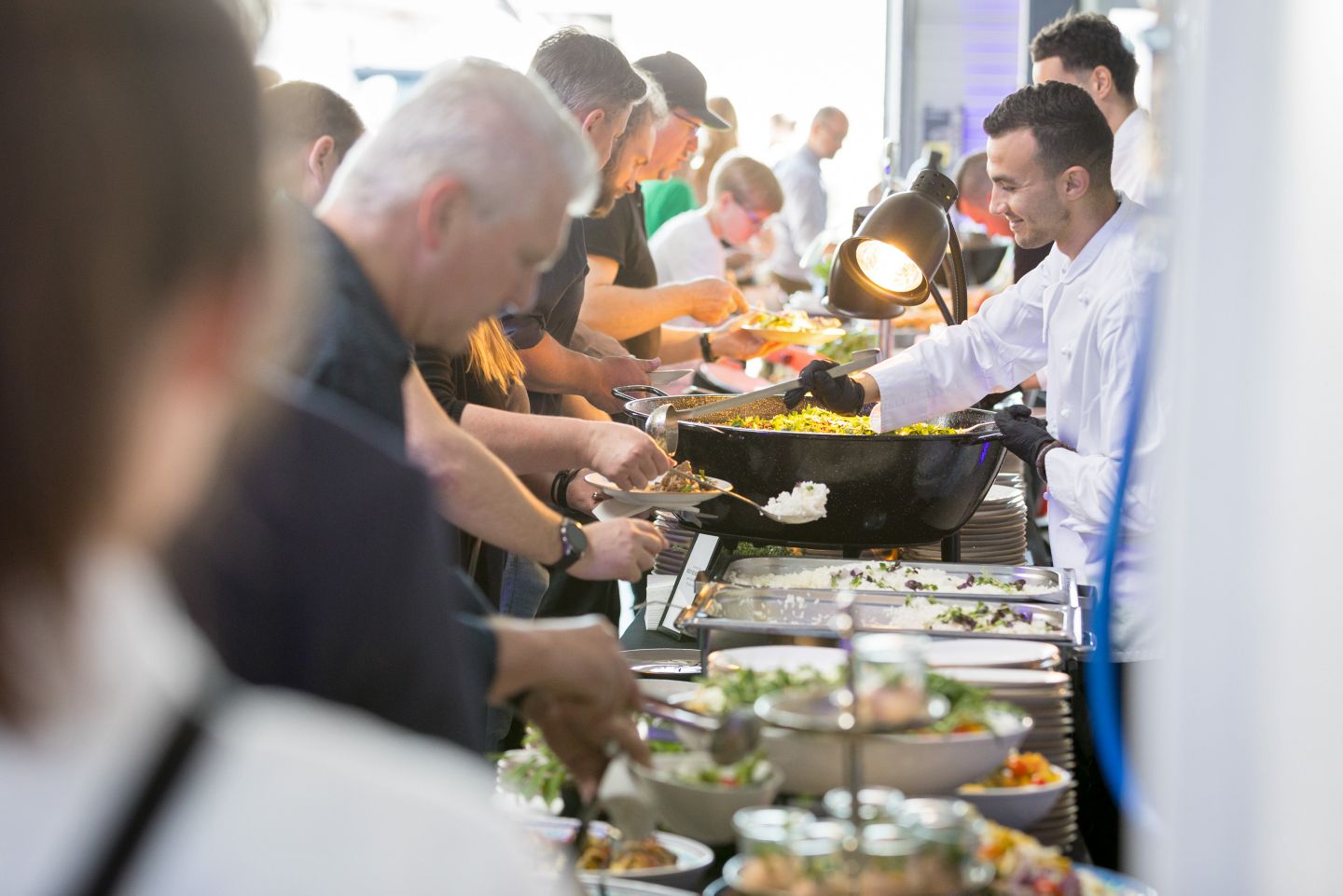 Im Anschluss an die Eröffnungs-Showeinfahrt mit dem Volvo FH Electric erwartete die Besucher des neuen Volvo Group Truck Centers in Kottingbrunn ein abwechslungsreiches Programm, wo einmal mehr das Thema Zukunft im Mittelpunkt stand. Zur Feier des Tages und dem Anlass entsprechend schmückten außergewöhnliche Kunden-Fahrzeuge, Sondereditionen und Elektro-Lkw von Volvo und Renault Trucks die Event-Terrasse. Gäste hatten die Möglichkeit Elektromobilität auch selbst zu testen, in Form einer Virtual Reality Station oder direkt als Beifahrer bzw. Fahrer eines Elektro-Lkw. „Auch bei diesem gelungenen Eröffnungsfest hat sich sehr deutlich gezeigt, dass Elektromobilität erlebt werden muss, um ihre unbestrittenen Vorteile zu erkennen“, erklärt Patrick Dornig. Bei Führungen durch die Werkstatt und das Bürogebäude konnten sich Besucher einen ersten Eindruck vom Neubau verschaffen. Um auch den Nachwuchs für Lkw zu begeistern, gab es zudem eine Hüpfburg, individuell gestaltbare Fähnchen und eine Fotobox. Kulinarische Highlights aus Frankreich und Schweden sorgten bei musikalischer Untermalung für Genussmomente aus beiden Kulturen. Als Highlight schwebte mit Hilfe des verbauten Hallenkrans die Eröffnungstorte und das Dessertbuffet auf charmantem Weg von der Hallendecke.